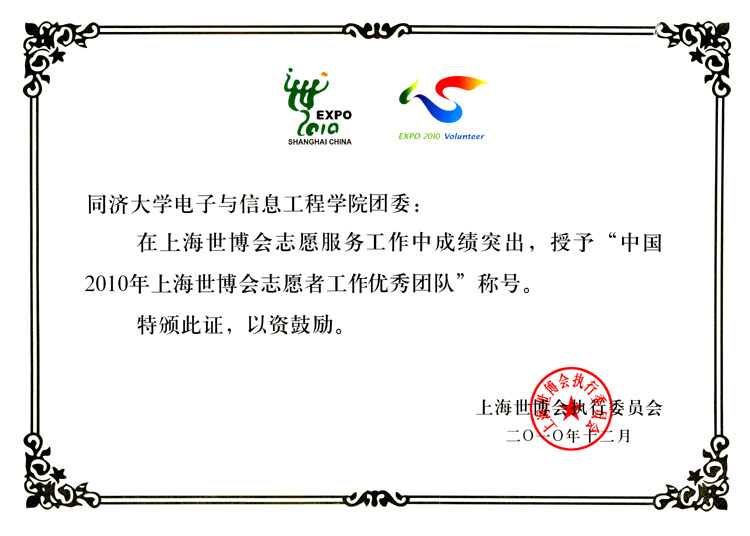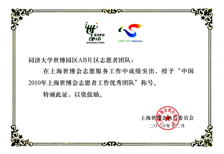 获得市级表彰的是:学院团委、公司志愿者所在AB片区志愿者团队两个单位均获“上海世博会工作优秀团队”称号,(全校共有6个团队获此荣誉);程 莉获上海市“创先争优,世博先锋行动”“五带头”共产党员称号;唐志宇获上海市教卫“世博先锋行动”优秀共产党员称号;刘永焕、程 莉、唐志宇、曹 阳、印海文、于 淼、冯怡然、何 伟、黄黎华、居征宇、李铭洋、李维丹、林显琦、田正之、闫明皓等15人分获“上海市优秀志愿者”荣誉。
