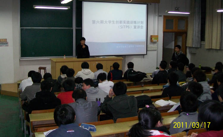 宣讲会上,学院创新俱乐部负责人徐广骏同学通过视频短片、图片、文字等,详细介绍了什么是SITP以及怎样参与SITP。同时邀请SITP4、5的优秀项目负责人孙强和王乾同学介绍了自己参与老员工科技创新活动的心得体会,鼓励更多的同学参与科技创新。