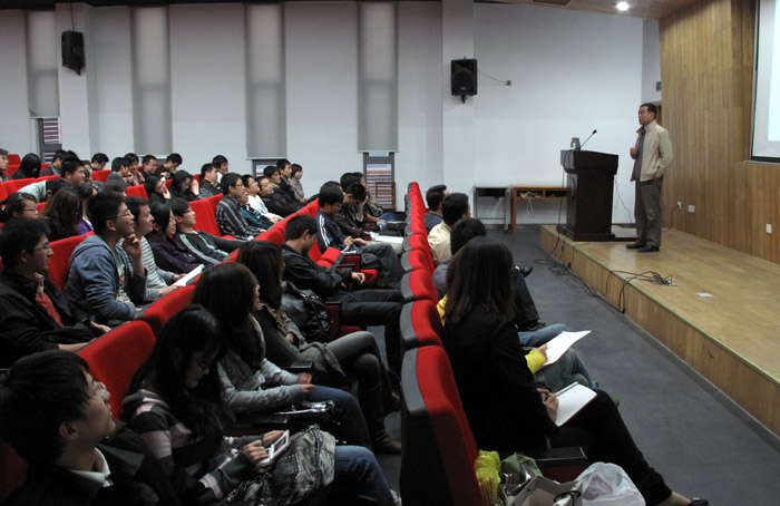 张教授以马克思主义理论为出发点,剖析了资本主义的表面民主及社会主义以人为本的内涵,进而引出对做人的探讨。同时,从动物与人的区别中解释了人独有的品质,并对主要社会热点进行讨论。讲座结束后,张教授针对同学的疑问做了细致的回答。