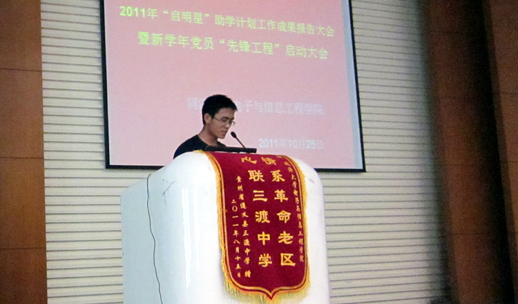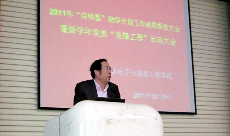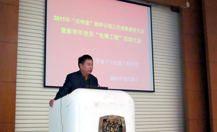 10月25日下午,yl23455永利2011年“启明星”助学计划总结会暨新学年党员“先锋工程”启动大会在嘉定校区行政南楼224报告厅召开。嘉定校区党工委副书记岳继光、校团委副书记陈一希,公司党委书记童学锋、副书记董变林,员工党总支副书记王晶晶、团委书记程莉及“启明星”支教团成员、学院200余名大二、大三的本科生党员和入党积极分子参加了大会。会议由董变林主持。