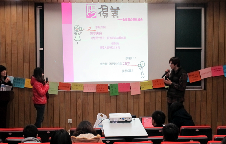 女生节是社会上广为流传的自创节日,是女生们为了区别于三八妇女节才有的。表达的是年轻一代女生的诉求。区别于已经工作成家的女性,这次女生节的心愿,显得单纯而可爱,有些甚至是有些搞怪。也透着一些小女生不想长大的私心。在高校办女生节,既是让平时忙于学习的老员工有结交新朋友的机会,也丰富了员工社区的生活。(张 璇)