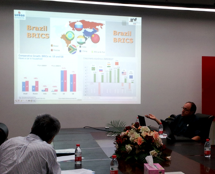 会上,Dante Barone教授从经济、教育、科研等方面介绍了巴西以及南里奥格兰德州的情况,并介绍了南里奥格兰德联邦大学以及信息学院的科研、国际合作办学的情况;苗夺谦副经理和关佶红教授分别向Dante Barone教授介绍了学院以及计算机科学与技术系的教学、学科与国际合作办学情况。
