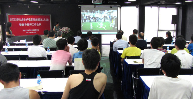 副经理苗夺谦在会上首先致辞,感谢学校对学院科技创新工作的支持,感谢各位指导教师的辛勤指导和同学们的积极努力;创新基地联络人刘永焕,从科技创新氛围营造、员工主体培养和创新能力提高等方面向会议作了年度工作汇报;ACM队员、启迪奖学金获得者、09级计算机科学与技术专业俞丁胜同学也汇报了自己的科技创新经历和心得体会。