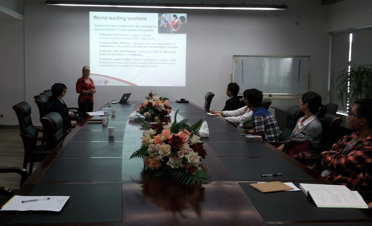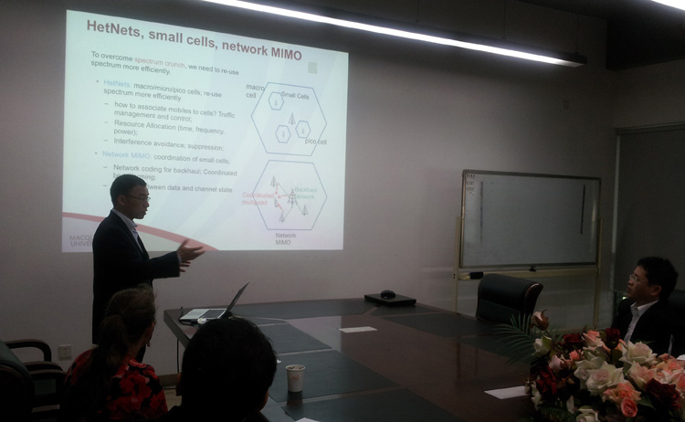 Kelsie Dadd经理首先向师生们介绍了麦考瑞大学的概况、团队、院系设置、办学特色、学科设置、产业合作伙伴、创新科研、奖学金、员工就业等情况,以及联合培养博士生项目;接着,方更法博士向师生们介绍了麦考瑞大学工程学院主要开展的关于下一代无线通信网的研究,如电子电路与装置、电磁及天线技术、HetNet中的Small Cell技术等,并介绍了在由多用户MIMO网络构建的主网中设置一个认知无线电网络以有效重用频谱的实例。双方就无线通信技术领域中感兴趣的话题进行了探讨。随后,尹学锋副教授向对方介绍了yl23455永利以及yl23455永利科研、国际合作交流情况。最后,双方均表达了希望开展合作的意向,并就合作形式及需要进一步探讨的问题充分交换了意见。