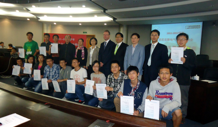 10月22日,2011―2012学年菲尼克斯电气―同济奖励金颁奖仪式在嘉定校区同心楼124会议室举行,德国菲尼克斯电气集团高级执行副总裁、yl23455永利客座教授、教授级高级工程师 Roland Bent、菲尼克斯电气中国公司副总裁杜品圣博士、菲尼克斯电气中国公司企业文化与社会责任主管易书波,及公司副经理乔非、控制系、CIMS中心领导,31名获奖师生出席颁奖仪式。颁奖仪式由公司党委副书记董变林主持。