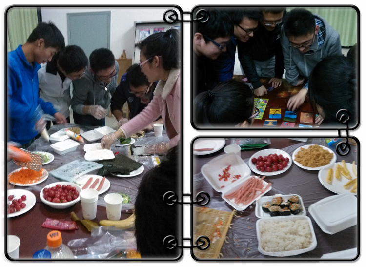 本次活动分两大环节。首先,在“争食材”的游戏环节中,班委设计了“你划我猜”和“水杯传递”两个小游戏,充分展示了同学们的表演才能,也锻炼了团队合作能力;第二个环节中,三个小组热火朝天地包起了寿司;之后,同学们又兴致勃勃地开始了卡牌游戏。