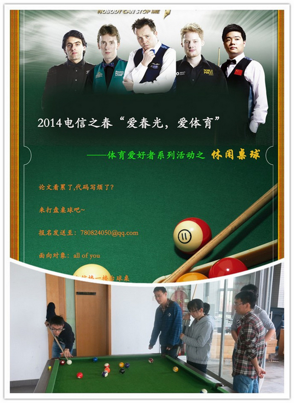 4月12日―18日,持续一周的“休闲台球”拉开了2014年“体育爱好者”系列活动的帷幕。本届体育爱好者系列活动由学院研究生会主办,面向嘉定校区员工,旨在为同学们提供一个展现自我、迸发活力的机会,传递年轻人永不言败的体育精神――“无体育不精彩”。同一项运动,每个人都会谱写出自己独特的青春风采。活动将持续一个月,由“休闲台球”、“极限飞盘”、“网球运动”等组成。