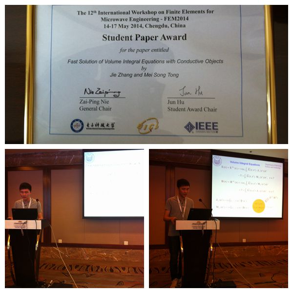 近日,公司电子科学与技术系10级本科生张杰同学受邀参加在成都举办的国际著名学术会议“The 12th International Workshop on Finite Elements for Microwave Engineering”(第12届微波工程有限元国际研讨会)”,他在“矩量法与积分方程解器”分会场作了题为“Fast Solutions of Electromagnetic Volume Integral Equations with Conductive Media(导电性介质电磁体积分方程的快速解)”的大会口头报告,受到与会代表的好评,事后被多位国际著名教授誉为“good job”。该论文是张杰同学在系主任童美松教授精心指导下完成并在今年一月份投稿、三月份正式接受的。会上大会技术委员会成员根据论文内容和口头报告质量进行打分评审,最终该论文被评为最佳论文之一。