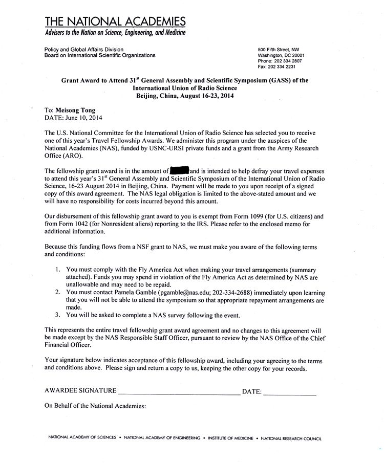 近日,公司电子科学与技术系主任童美松教授收到美国国家科学院国际科学组织委员会主任Kathie Bailey的来信,通知他已被国际无线电科学联盟美国国家委员会选为2014年的Travel Fellowship奖获得者,5000美元的奖金将用于资助他参加今年八月在我国首都北京举行的第31届国际无线电科学联盟大会暨科学研讨会(The 31st General Assembly and Scientific Symposium of the International Union of Radio Science)。上述奖项由美国科学院(NAS)、国际无线电科学联盟美国国家委员会(USNC-URSI)及陆军研究办公室(ARO)共同支持和赞助,由美国科学院国际科学组织委员会负责管理,旨在吸引和资助无线电科学领域的著名科学家参加国际无线电科学联盟大会暨科学研讨会。